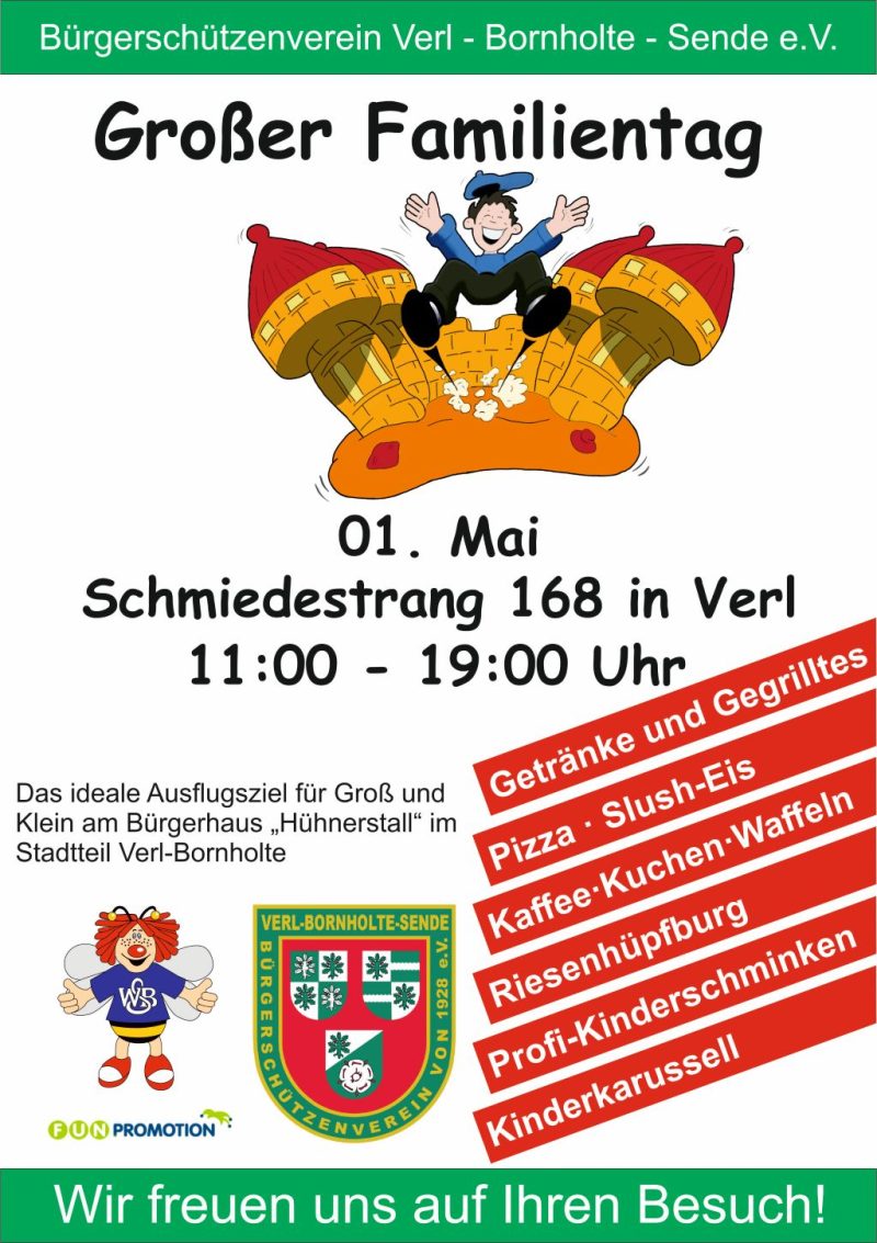 Am 1. Mai laden wir herzlich zum Großen Familientag am Schützenheim („Hühnerstall“) in Verl-Bornholte, Schmiedestrang 168, ein.