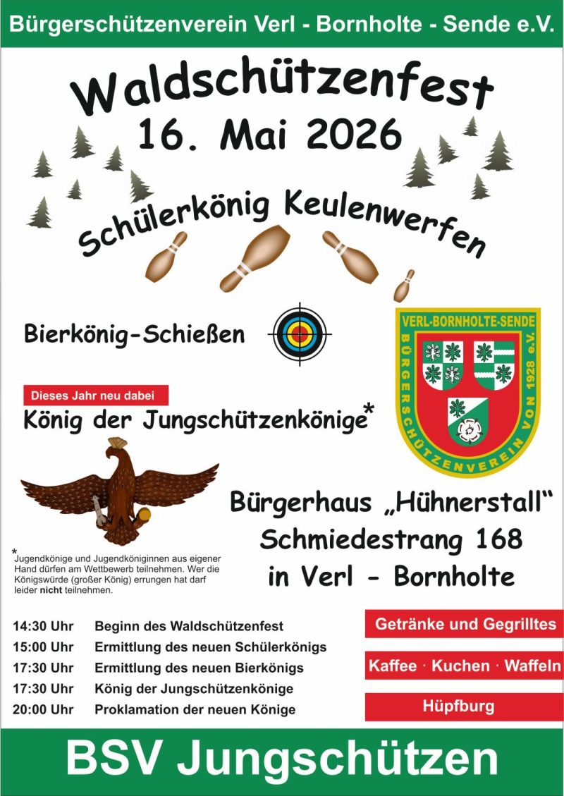 Die Jungschützen laden herzlich zum diesjährigen Waldschützenfest ein – ein Tag voller Spaß, Tradition und guter Laune für Groß und Klein. Rund um das Schützenheim „Bürgerhaus – Hühnerstall“ am Schmiedestrang 168 in Verl-Bornholte erwartet euch ein buntes Programm.